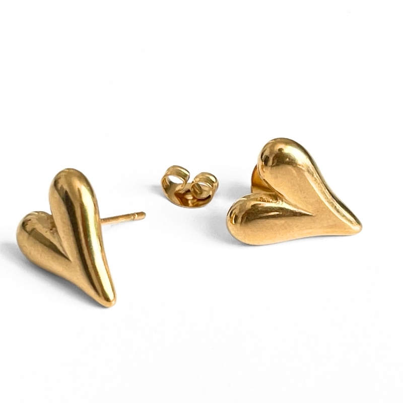 Et sæt ørestikker med store hjerter i en enkel og rundet form. De måler 14 mm i højden og 12 mm i bredden, så de fylder lidt mere på øret end mange andre stikker, uden at blive tunge. Lavet i guldfarvet rustfrit stål, som har en blank overflade og er nemme at matche med både hverdag og lidt finere tøj. Formen er blød og lidt organisk – ikke et klassisk symmetrisk hjerte, men stadig helt tydeligt hjerteformet. Sidder fladt på øret og holdes fast med en lille sommerfuglelås bagpå. Gode hvis man gerne vil have lidt størrelse uden at det larmer for meget.
