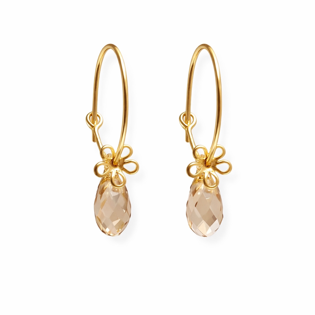 De her flotte øreringe er meget nemme at lave. Du skal bare rette det lille "knæk" der er i enden på creolerne forsigtigt ud og tilbage igen når du har hængt dråberne og blomstervedhængene på.