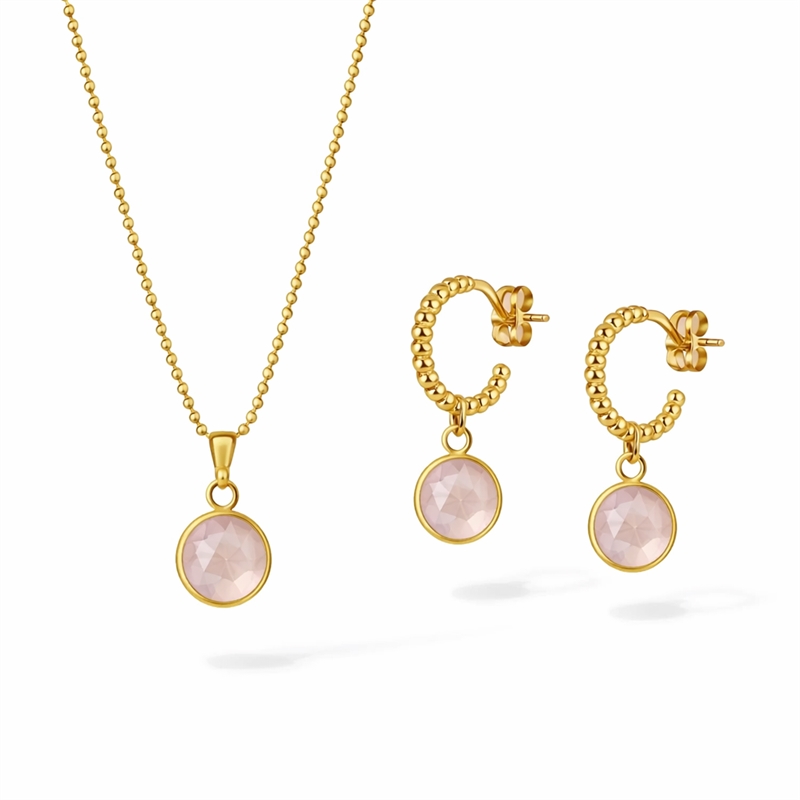 Kuglehalskæde og kugle øreringe med rosakvarts vedhæng