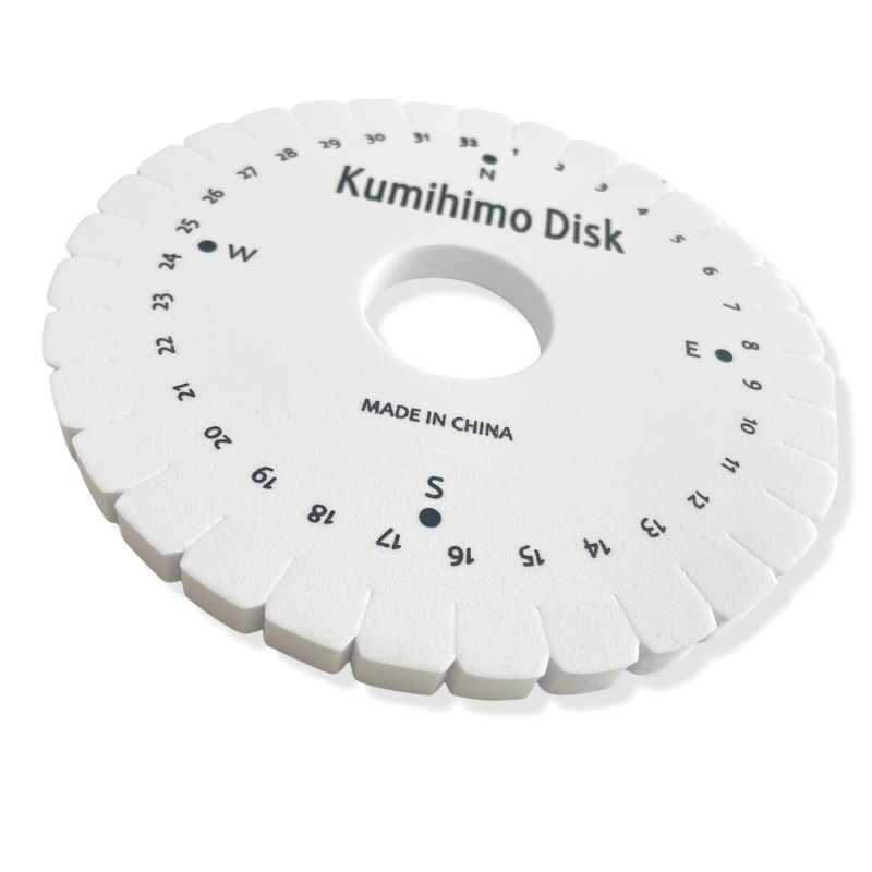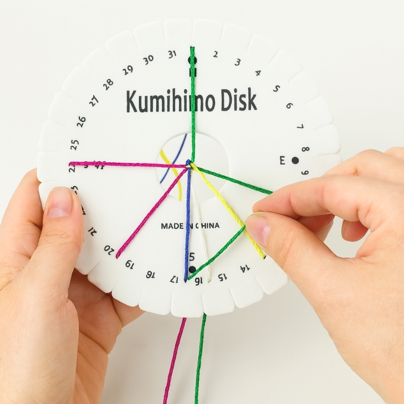 🌿 Brug skiven til at flette armbånd, halskæder eller nøgleringe i japansk kumihimo-teknik.