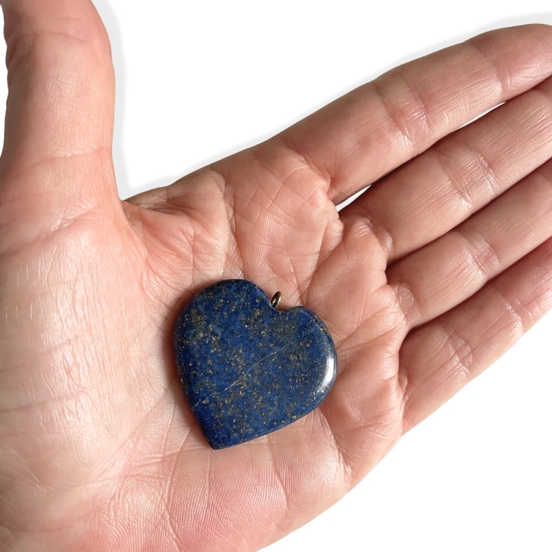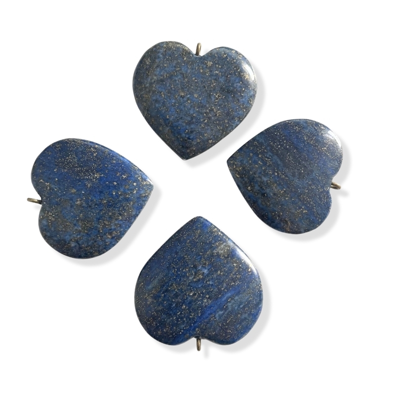 De store hjerter i lapis lazuli har en flot, dyb blå farve med naturlige gyldne prikker og lyse årer. Overfladen er slebet og poleret, så den føles glat og behagelig. Hver sten er forskellig – nogle er mørkeblå og ensartede, mens andre viser mere spil med hvide og gyldne felter. Det giver hver enkelt et levende og naturligt udtryk.