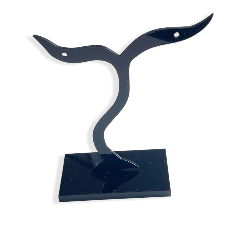 Et lille, praktisk smykkestativ i sort akryl med to huller til ophæng. Formen har en blød, svunget silhuet, som giver et fint løft til øreringe eller små vedhæng. Overfladen er blank, og materialet er let at tørre af og holde rent.