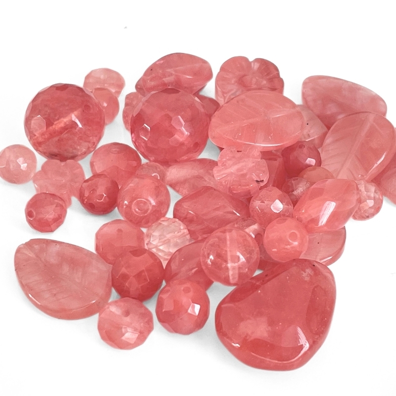 Et smukt og levende mix af cherry kvartsperler i varme rosarøde nuancer. Stenene har et klart, næsten gennemsigtigt udtryk med små farveskyer og spil i dybden, som giver liv i smykket. Formen varierer fra runde og facetterede perler til bløde, organiske former og udskårne blade.