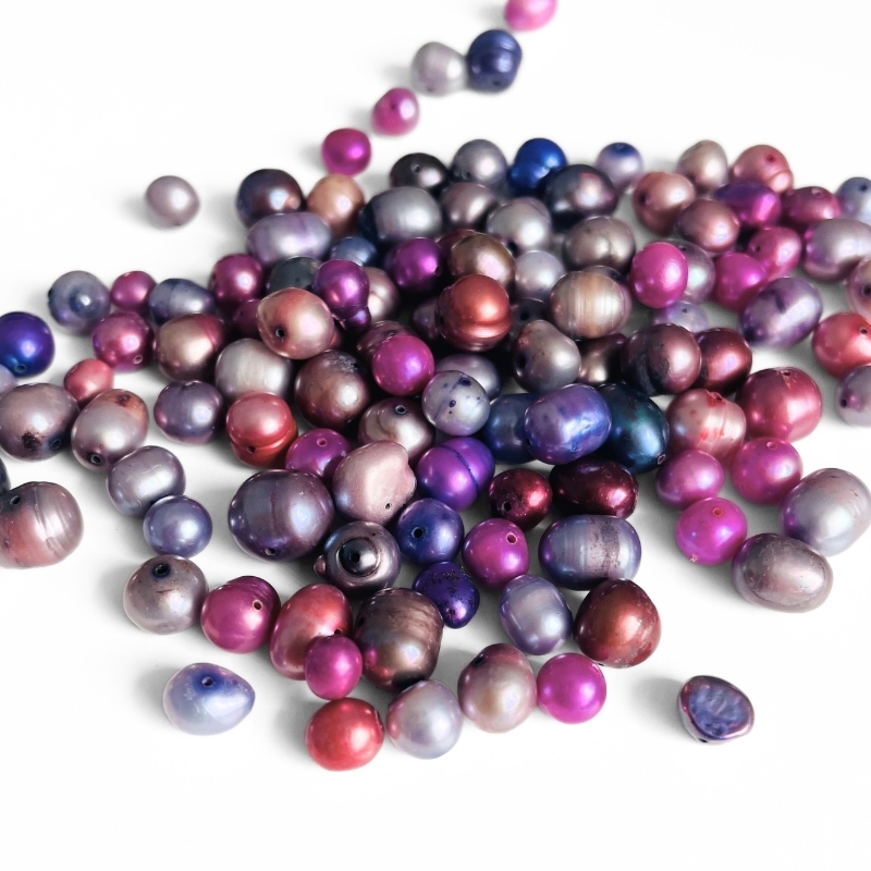 En pose med ca. 60 gram blandede ferskvandsperler i flotte lilla, rosa og mørke metalliske toner. Perlerne har en naturlig og organisk form, som gør dem ideelle til smykker med personlighed og struktur. De varierer i størrelsen fra ca. 5 til 10 mm, og hver enkelt har sit eget udtryk med små ujævnheder, som er en del af charmen ved ægte ferskvandsperler.