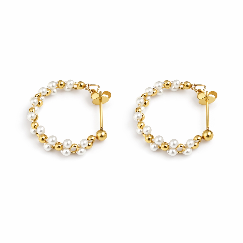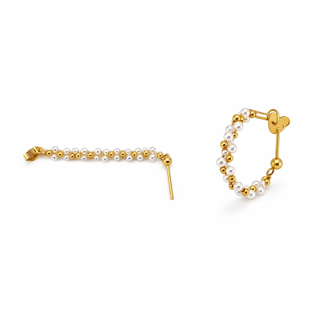 Ørestikker med hvide perler og guldperler fastgjort i ørestikken og låsen