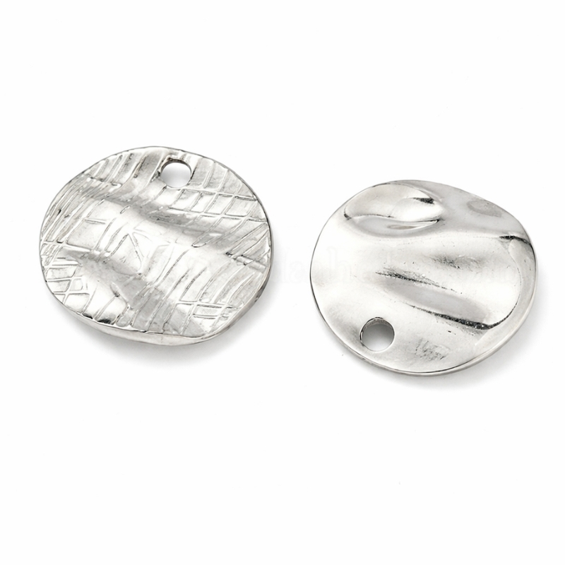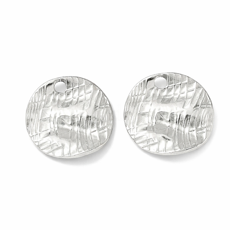 Runde vedhæng i rustfrit stål med et præget mønster på forsiden og glat bagside. De har en let buet overflade og et hul i toppen, så de er lige til at sætte i ørekroge, snor eller mellemled. Stålet har en neutral blank finish, der passer godt ind i både enkle og mere rå designs.