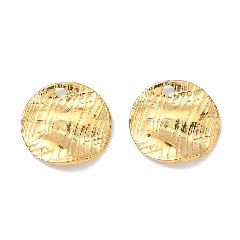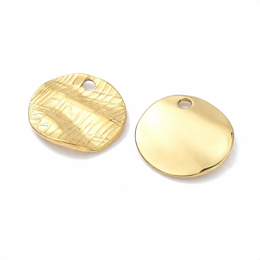 Runde vedhæng i rustfrit stål med et præget mønster på forsiden og glat bagside. De har en let buet overflade og et hul i toppen, så de er lige til at sætte i ørekroge, snor eller mellemled. Stålet har en neutral blank finish, der passer godt ind i både enkle og mere rå designs.
