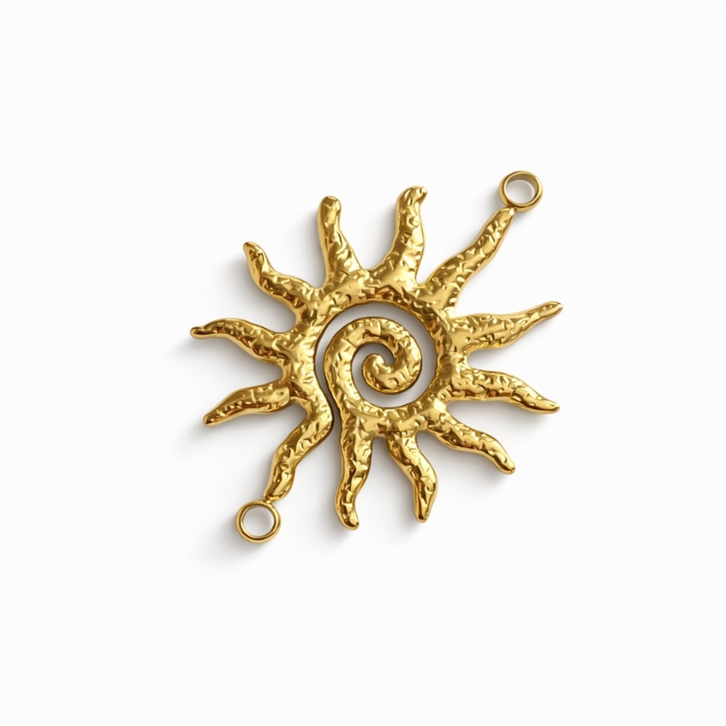 Denne solformede connector er lavet i rustfrit stål med en guldfarvet IP-belægning. Overfladen har en let hamret og ujævn struktur, som giver et mere råt og levende udtryk end helt glatte metaldele. Solens spiral i midten og de ujævne stråler giver et håndlavet look, selvom delen er maskinfremstillet.