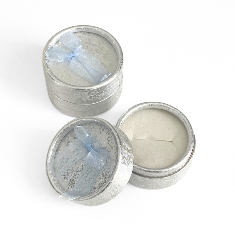 Disse små æsker er lavet til opbevaring og gaveindpakning af smykker som ringe, øreringe eller små vedhæng. Æskerne er runde og har en sølvfarvet overflade med diskret mønster. Låget er pyntet med et let, blåligt bånd, der giver en enkel detalje uden at tage fokus fra smykket indeni. Indeni ligger en lille hvid pude med slidser, så smykket kan sættes fast og præsenteres pænt, når æsken åbnes.