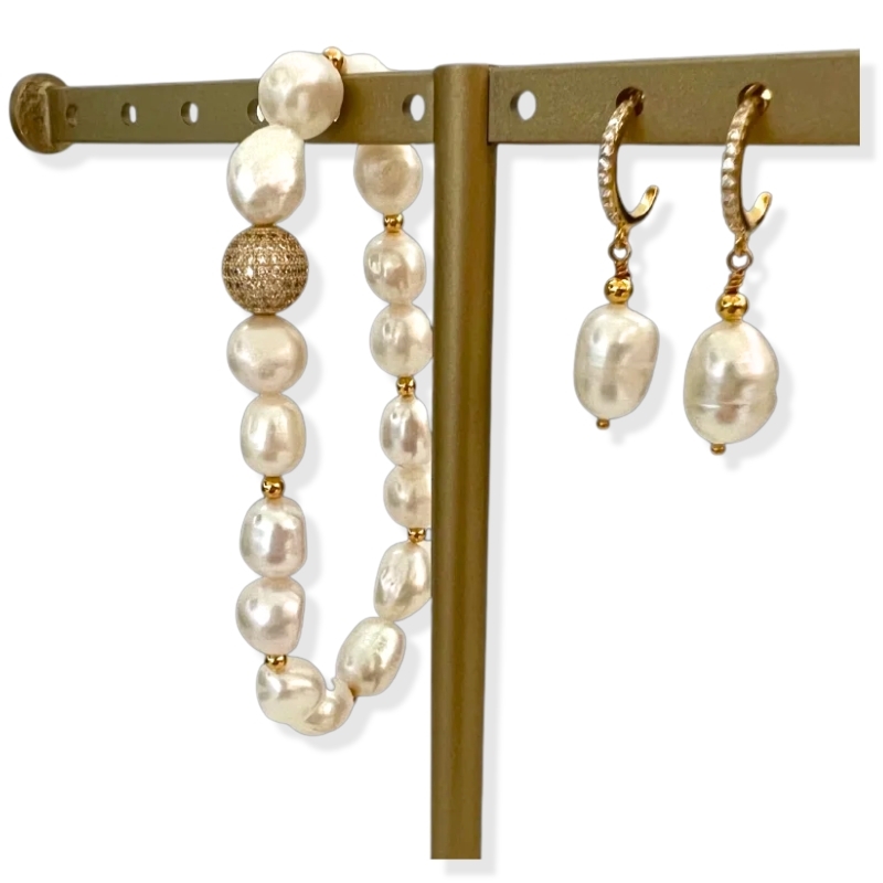 Her får du en samlet pakke med alt du skal bruge for at lave et armbånd og et par øreringe, der matcher. Armbåndet laves med barokke ferskvandsperler og små 3 mm afstandsperler i forgyldt sterling sølv, så det falder pænt på håndleddet. Midt i armbåndet sidder en stor perle med zirkonia-sten, som giver et lille skær uden at det larmer.