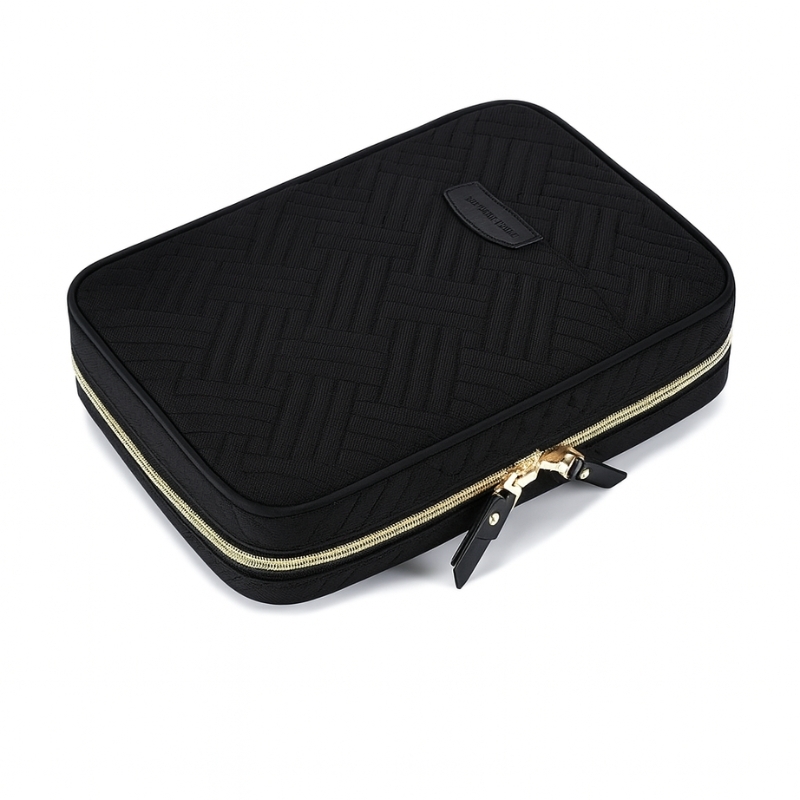 Et smykkeskrin i praktisk rejsetaskeformat, her i klassisk sort. Ydersiden har et quiltet mønster, der giver en rolig overflade, mens lynlåsen hele vejen rundt sørger for at indholdet ligger sikkert. Indvendigt er tasken opdelt i flere sektioner med forskellige funktioner. Der er plastlommer til ringe og små øreringe, puder til at sætte smykker fast og elastiske stropper, der holder kæder og armbånd på plads uden at filtre. Med målene 27 x 19 x 4 cm er tasken let at have med i kufferten eller tasken, men rummer alligevel et godt udvalg af smykker. Den kan lige så vel bruges som fast opbevaring derhjemme, hvor man nemt får overblik over sine smykker. En enkel og funktionel løsning til både hverdag og rejse.