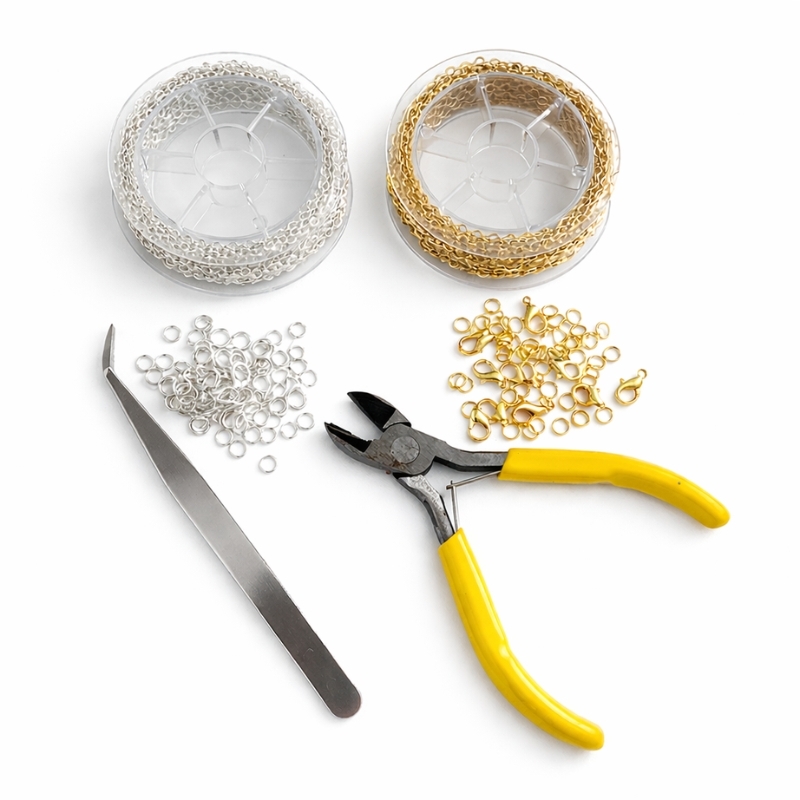 Der følger en bidetang med, som kan klippe kæden i den længde, du skal bruge, samt en pincet til at holde små dele, når du arbejder. Det gør det lettere at sidde derhjemme ved bordet og samle smykker i ro og mag.