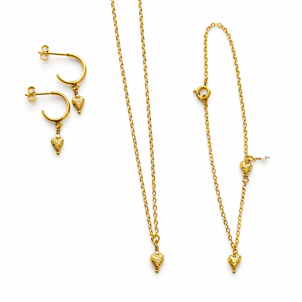 Smykkesæt,med Halskæde, armbånd og øreringe. Vedhæng med lille banket hjerte og lille shell perle.