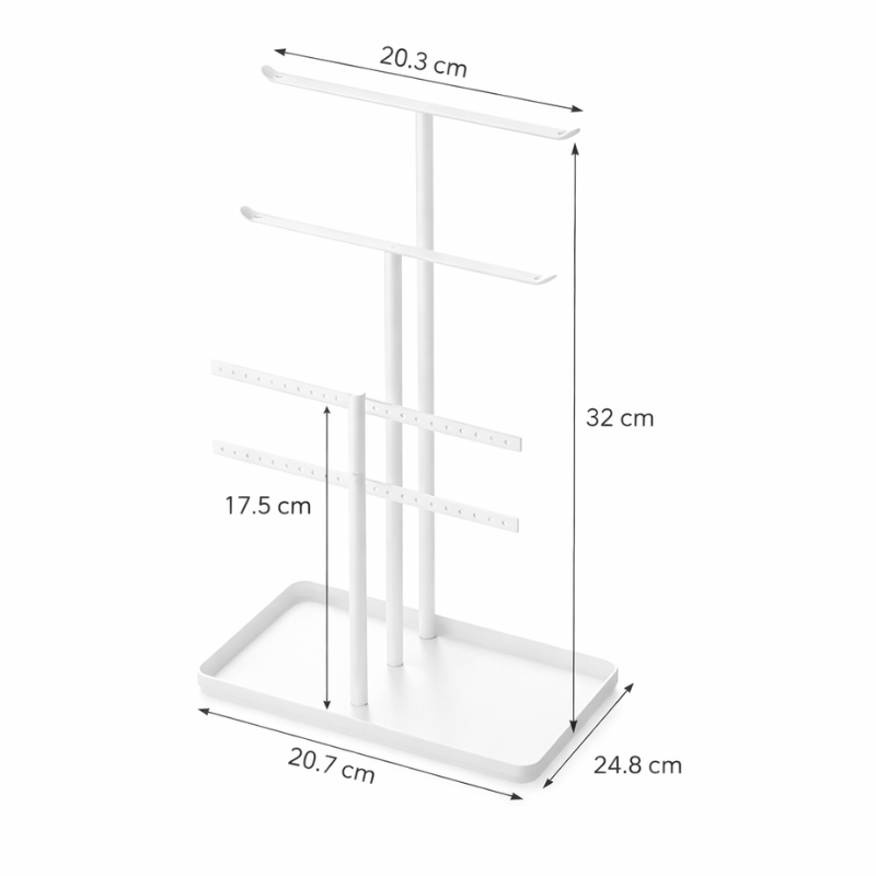 Her får du et hvidt smykkestativ med fire arme, så du nemt kan fordele dine smykker og få overblik. De to øverste stænger er oplagte til halskæder, armbånd og også fingerringe, som bare kan trækkes ned over stangen. Det gør det let at se, hvad du har, og vælge det, du vil bruge.