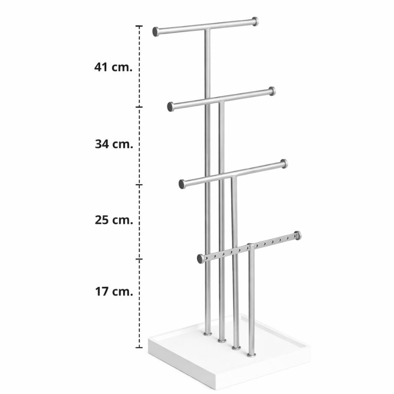 Dette smykkestativ har fire arme i sølvgrå metal, som hver måler 15 cm i bredden. Her kan du hænge både korte og lange halskæder samt armbånd i forskellige størrelser. Den nederste arm har huller, så du også kan hænge øreringe op og få dem samlet ét sted.