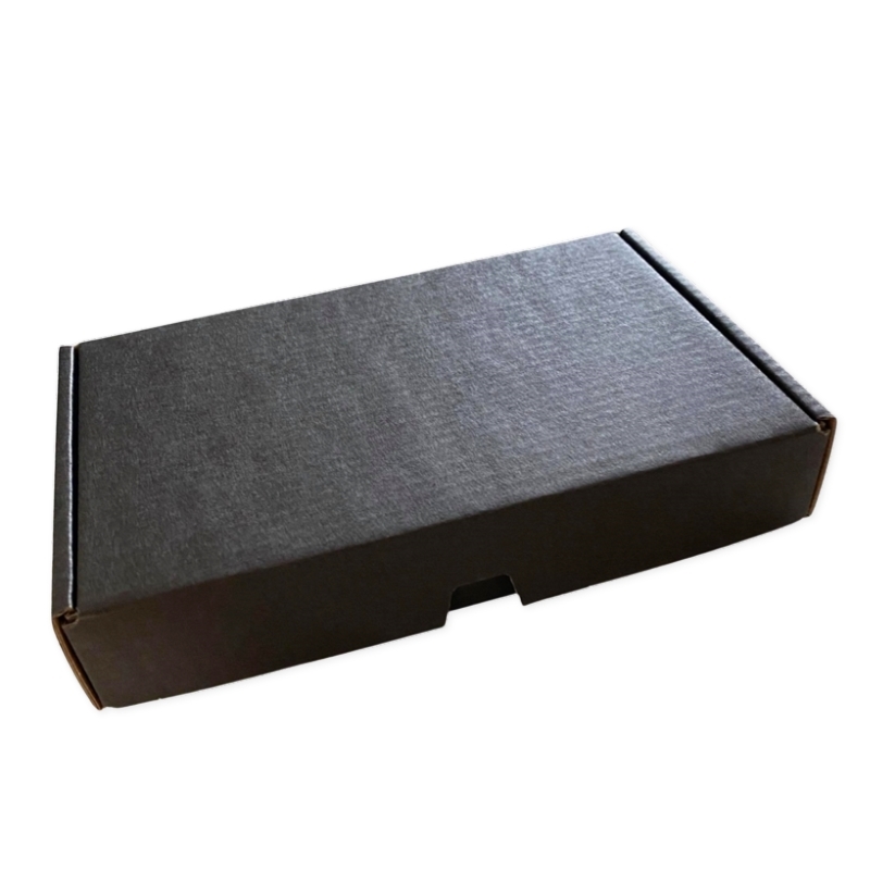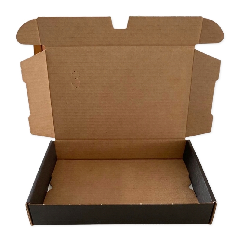 Små papkasser i sort, som er gode til mindre forsendelser og giver et neutralt og stilrent udtryk. De er lavet i solid pap og er nemme at folde uden brug af tape. Kasserne har lav højde, hvilket gør dem velegnede til smykker, små accessories eller gaveartikler, der skal sendes sikkert.