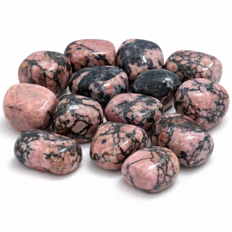 Rhodonit kendes på sin varme rosa farve med mørke, næsten sorte årer og mønstre. Nogle sten er mere lyserøde, mens andre har dybere toner med tydelige kontraster. Hver sten er unik i både størrelse og tegning, da det er et naturmateriale, som er slebet og poleret glat.
