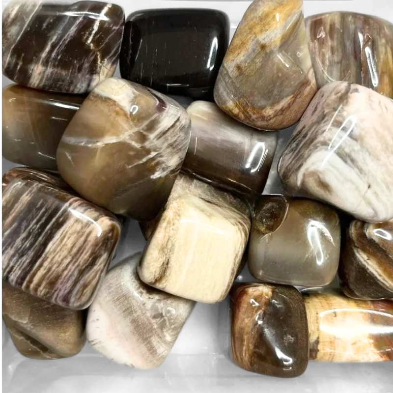 Geologisk: Forstenet træ består af fossilt træ, hvor cellerne over tid er blevet udskiftet med kvarts eller opal. Når opal er til stede, omtales det som opaliseret træ. Farverne varierer afhængigt af mineralindholdet – og giver hver sten sit helt unikke mønster og spil.