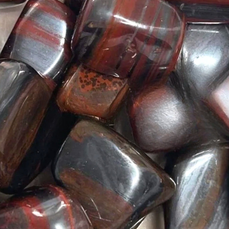 Tigerjern er en sammensat sten, der består af hæmatit, rød jaspis og tigerøje – og det kan både ses og mærkes. Den har karakteristiske striber og farvespil i rødbrune, sorte og sølvagtige nuancer. Hver sten er helt sin egen i mønster og intensitet, og overfladen er glat og blank efter polering.