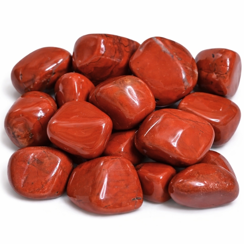 Rød jaspis er en poleret natursten med varme røde og rødbrune nuancer. Nogle sten har en helt ensartet farve, mens andre kan have små naturlige variationer eller diskrete mønstre i overfladen. Hver sten er forskellig i både størrelse og farvetone, da de formes af naturen og derefter slibes glatte.