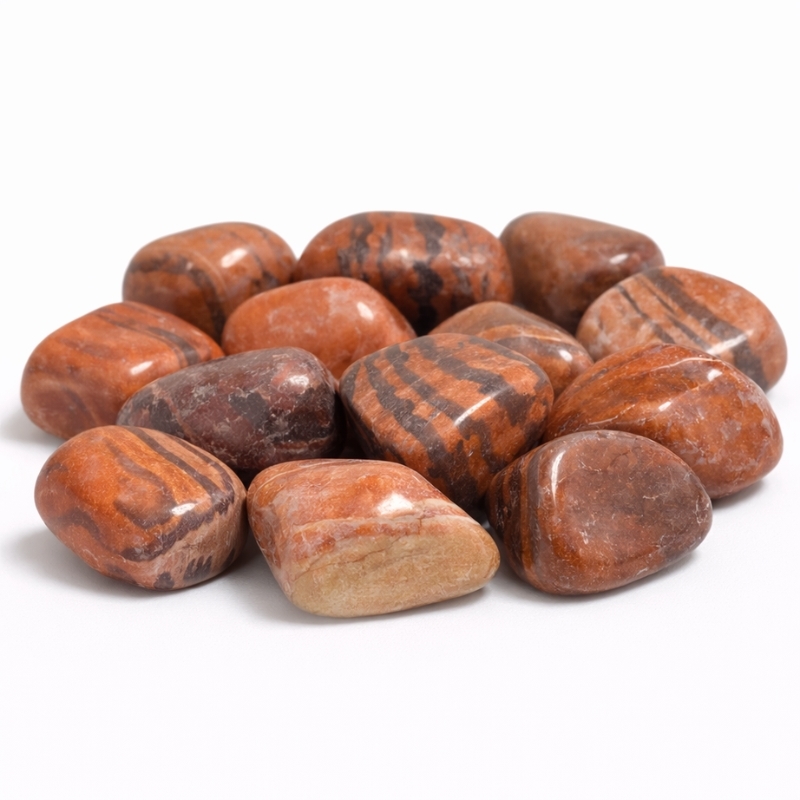 Printstone er en poleret natursten med varme brune nuancer og tydelige striber eller bånd. Mønstrene kan være både lige og bølgende, og farverne spænder fra lys brun og beige til mørkere rødbrune toner. Nogle sten har få tydelige lag, mens andre har mange fine striber, der giver et næsten træagtigt eller sandstensagtigt udtryk.