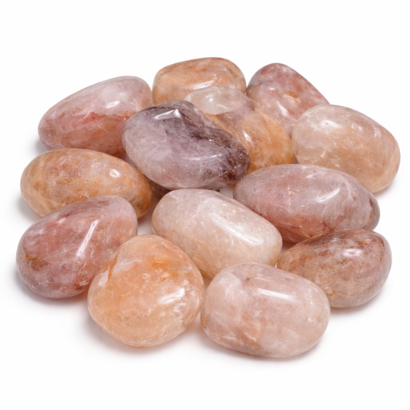 Denne sten består af klar eller let farvet kvarts med naturlige inklusioner af hæmatit – det giver den et levende og ret unikt udtryk. Nogle har fine rødbrune skygger, andre har tydelige pletter eller slør. Alle er forskellige, og det er netop det, der gør dem særligt spændende at bruge som lommesten eller meditationssten.