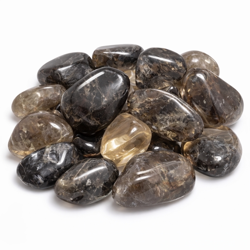 Røgkvarts er en poleret lommesten med farver, der spænder fra let gennemsigtig grå til dyb brunrøg. Nogle sten er næsten klare med et svagt slør, mens andre er mørkere og mere tætte i farven. Indeni ses ofte naturlige skygger og fine spil, som giver stenen liv uden at den virker prangende.