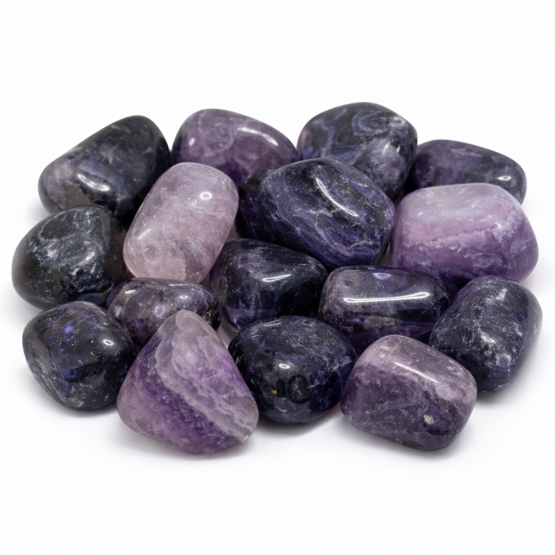 Lilla fluorit kendes på sine smukke nuancer fra lys violet til dybere lilla toner. Nogle sten har klare partier eller fine farveskift, mens andre er mere ensartede. Hver sten er naturlig og varierer derfor i både størrelse og udtryk. De er slebet glatte og uden hul og bruges typisk som lommesten.