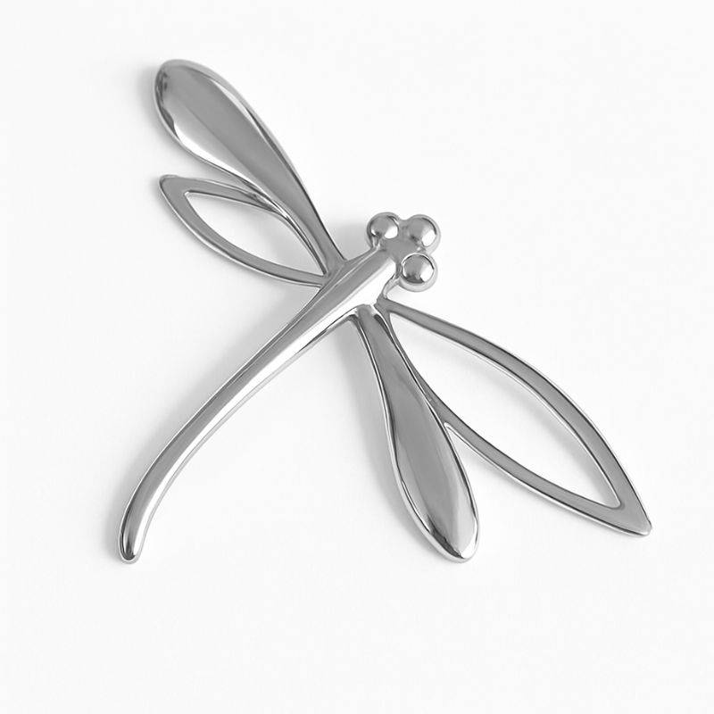 Et stort og iøjnefaldende vedhæng formet som en guldsmed med en blanding af åbne og lukkede vingeformer. Overfladen er glat og blank. Vedhænget er lavet i 304 rustfrit stål, som er både stærkt og nikkelfrit. Formen er let buet og giver en smule liv og bevægelse i designet. Det 2 mm store hul i toppen gør det nemt at sætte i en tykkere lædersnor eller kæde.