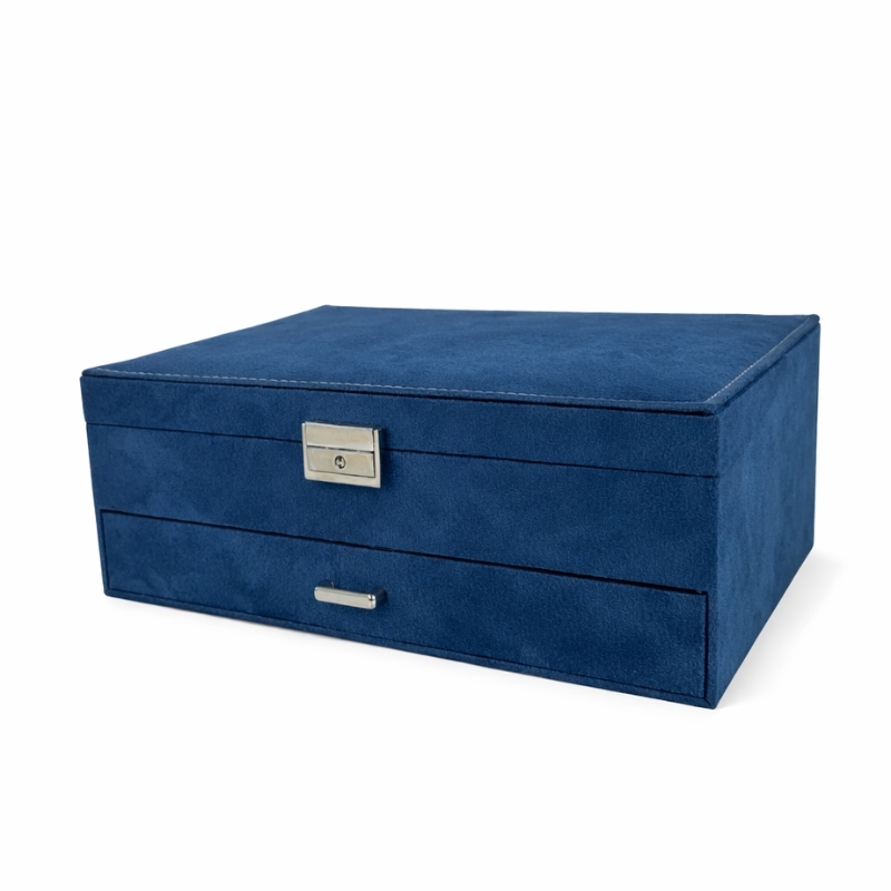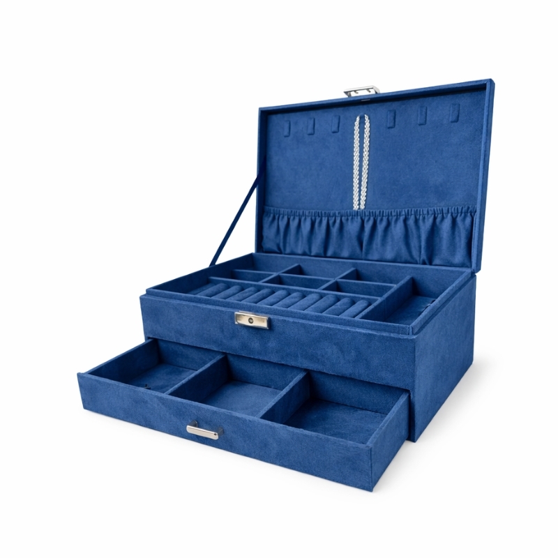 Smykkeskrin i blå med flere rumBlå smykkeæske med nøgle og skuffe