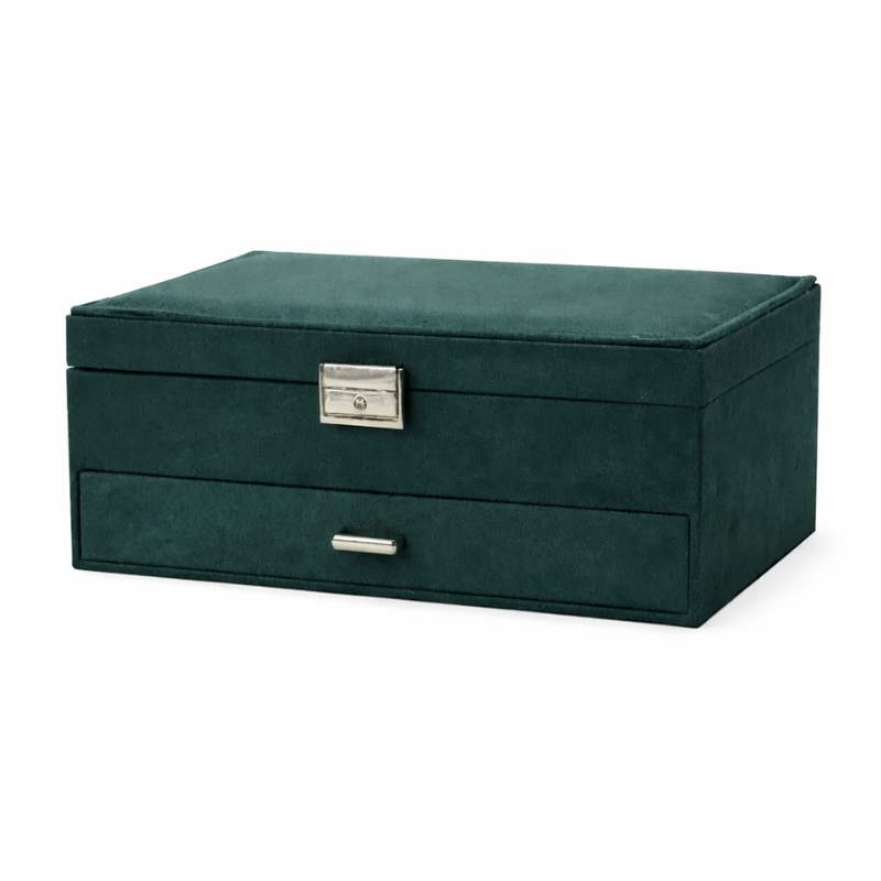 Mørkegrønt smykkeskrin med skuffe og nøgle