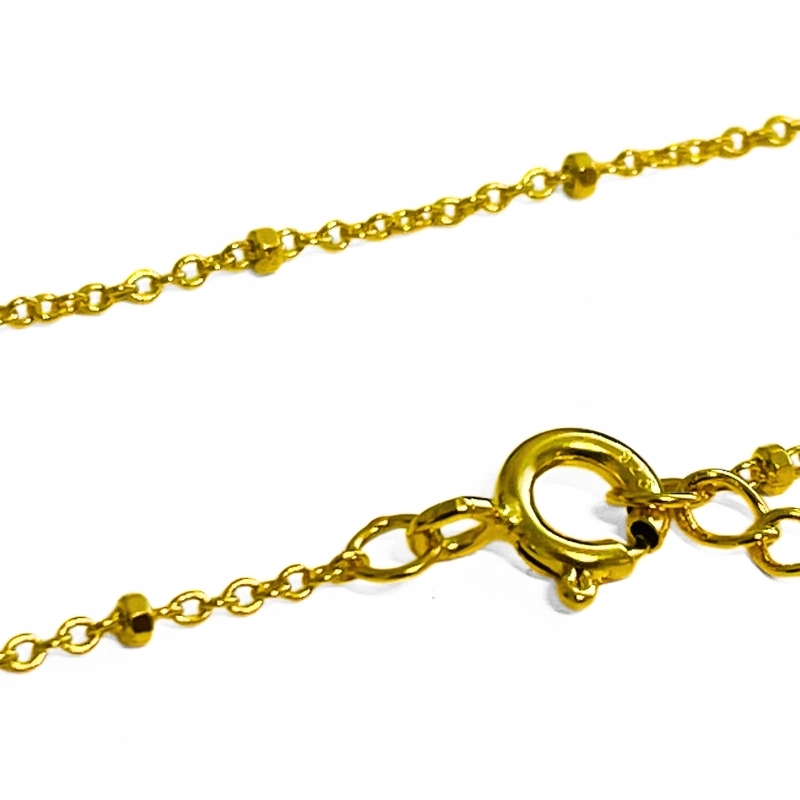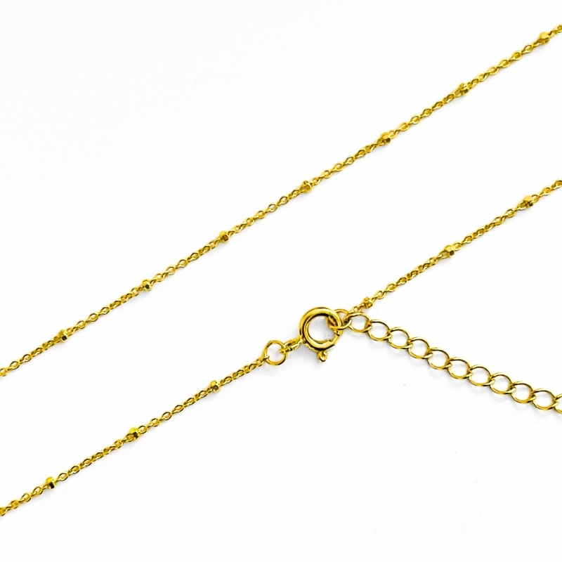 En fin og tynd kæde med små kantede perler fordelt jævnt langs hele længden. Kæden er let og spinkel i udtrykket, og den sidder pænt på huden uden at fylde for meget. De små perler måler ca. 1,8 mm og giver lidt struktur og spil uden at kæden bliver voldsom. Den er lavet i forgyldt Sterling sølv og måler 40 cm, men kan udvides op til 45 cm med den påmonterede forlængerkæde. Du kan bruge den alene, hvis du er til det enkle, eller kombinere den med andre kæder i forskellige længder. Den fås også som armbånd, hvis du vil matche.
