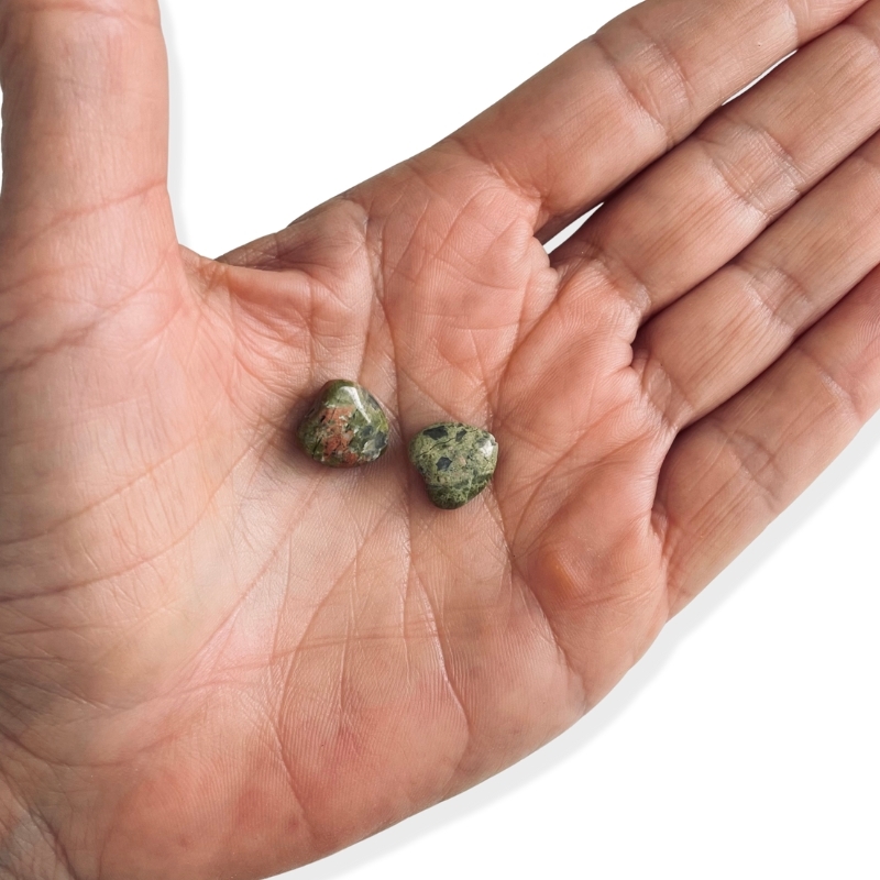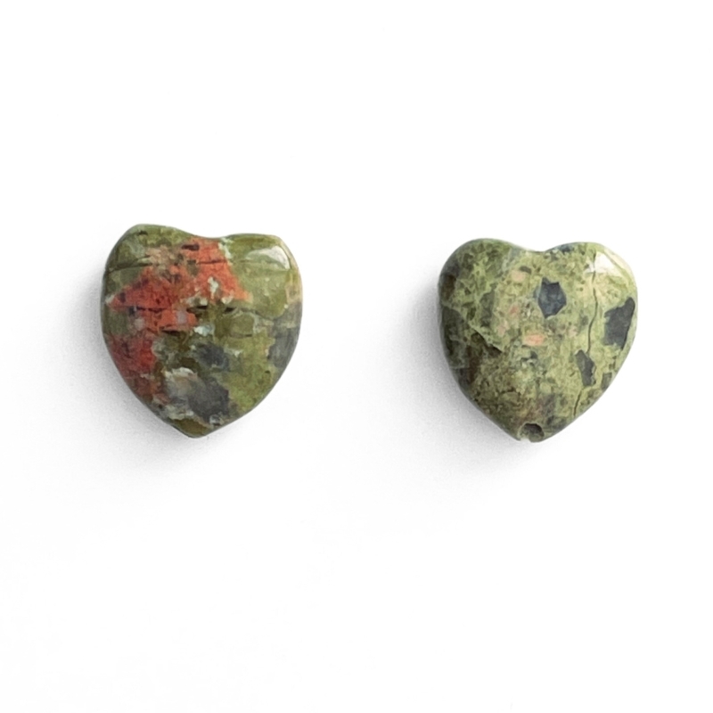 Disse hjerteformede perler er lavet af unakit, en natursten der kendes på sin blanding af grøn epidot og rosa feldspat, ofte med mørkere felter. Kombinationen giver et levende og farverigt udtryk, hvor hver sten har sit eget mønster. Overfladen er poleret og glat, og den lille størrelse gør dem nemme at indarbejde i mange forskellige designs. Med et lodret hul kan de nemt monteres direkte på kæde, snor eller stift.