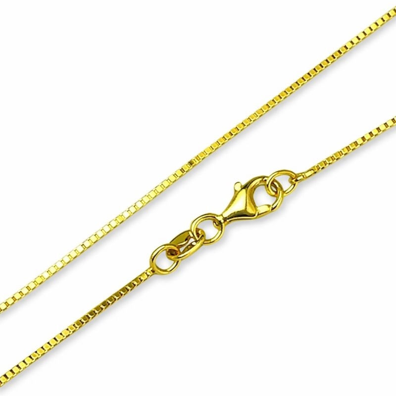 En klassisk og tynd Venezia-kæde i forgyldt Sterling sølv, som er nem at bruge til mange slags smykker. Leddene ligger helt tæt og danner en flad kæde med en glat og jævn overflade. Kæden er 45 cm lang og lukkes med en lille karabinlås på 9 mm. Den er 1,2 mm tyk, så den er hverken for fin eller for kraftig – og fungerer både alene eller med et lille til mellemstort vedhæng. Et godt valg, hvis du gerne vil have en enkel kæde med lidt fasthed og struktur i leddene.